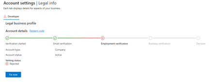 1- "If your employee verification is rejected, confirm the primary-contact email address is in the same domain as the Company domain name in the Legal Profile."