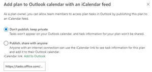 We have a private plan. When wanting to add to outlook Calendar, we get this prompt. It seems like all access or nothing with regards to privacy. Can a Plan be published to Outlook Calendar so onl...