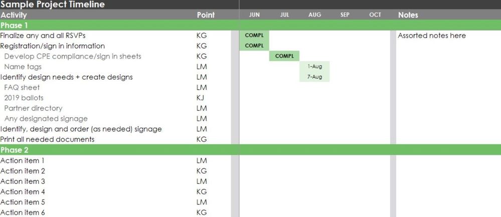 My team is currently exploring project management / collaboration tools for our HR team. Since my company is already on Office 365, I recommended we use Planner. Personally, I manage all my projects via a super basic Excel timeline template I created. It's so simple; we're small, have moving target timelines and don't deal in dependencies or classic resource scheduling, so we just need something basic to manage all the parts and pieces of a project. Something non-project managers can quickly catch onto. Creating a project timeline is how I start every project. However, if we start to use Planner more for task management, I'd love to have a visual way to create and monitor the schedule, something that is more of a gantt chart style timeline and not just a calendar view. I attached an image below of what I currently use in Excel.