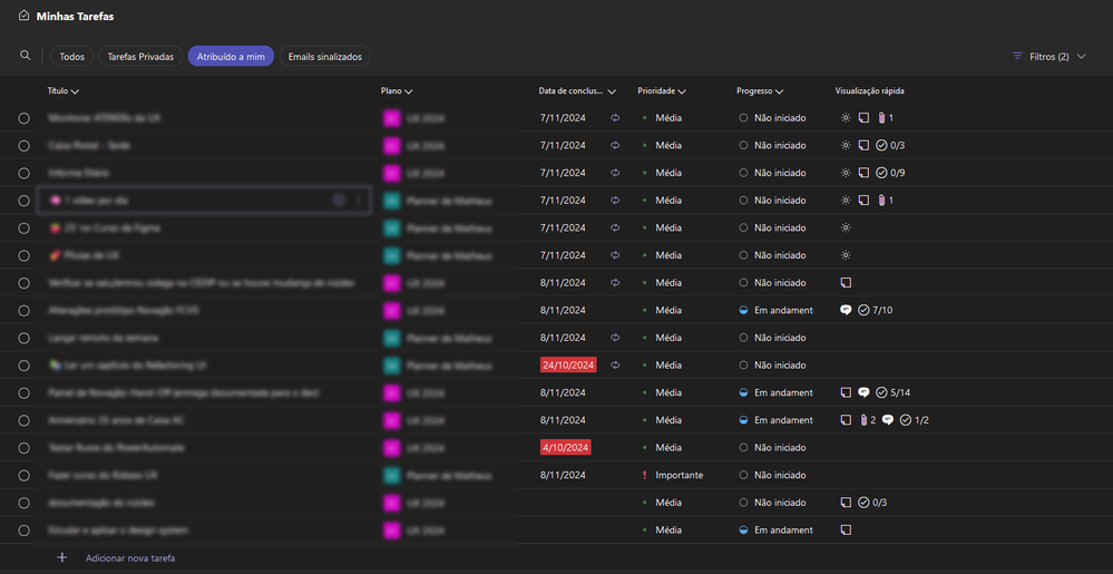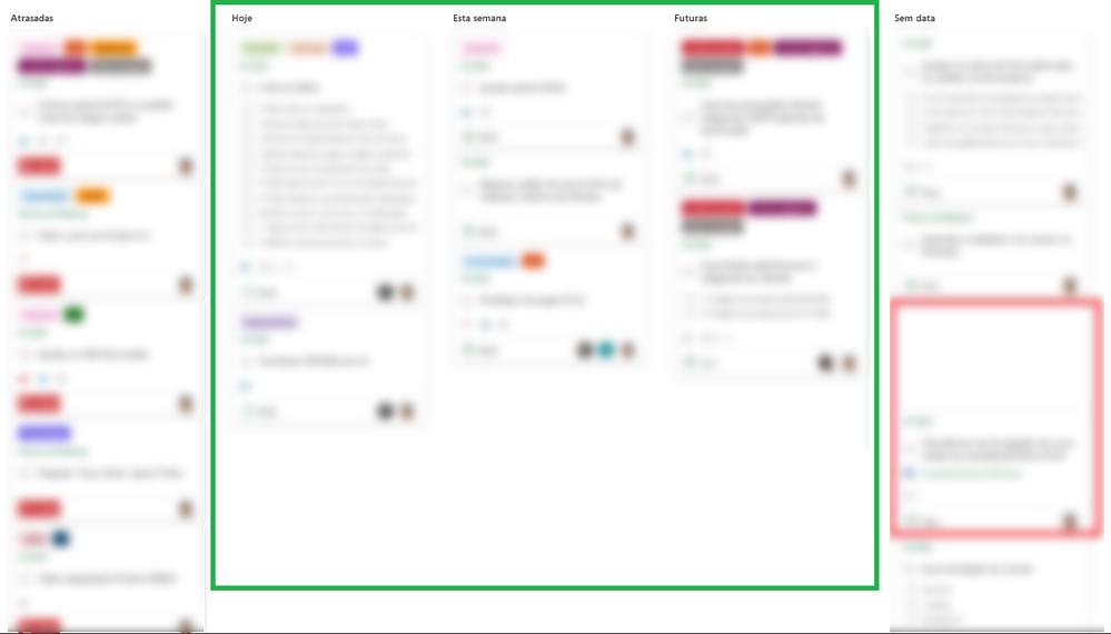 - The "Assigned to me" view, which I use 95% of the time, was worsened. On the old Planner I could choose a Board/Kanban view and group tasks by Due Date. This was perfect, because then I could view the tasks due today, due tomorrow, due this week and due in the near future (the green are on the image below). Now, I only have a overwhelming list view which doesn't help me focus on the tasks that are due soon. The Kanban/Board view is still available inside each Plan but this doesn't solve the problem because my tasks span multiple Plans. I need a unified view where I can see all my Assigned tasks in all Plains, and I need the Kanban/Board view so I easily prioritize by due date.