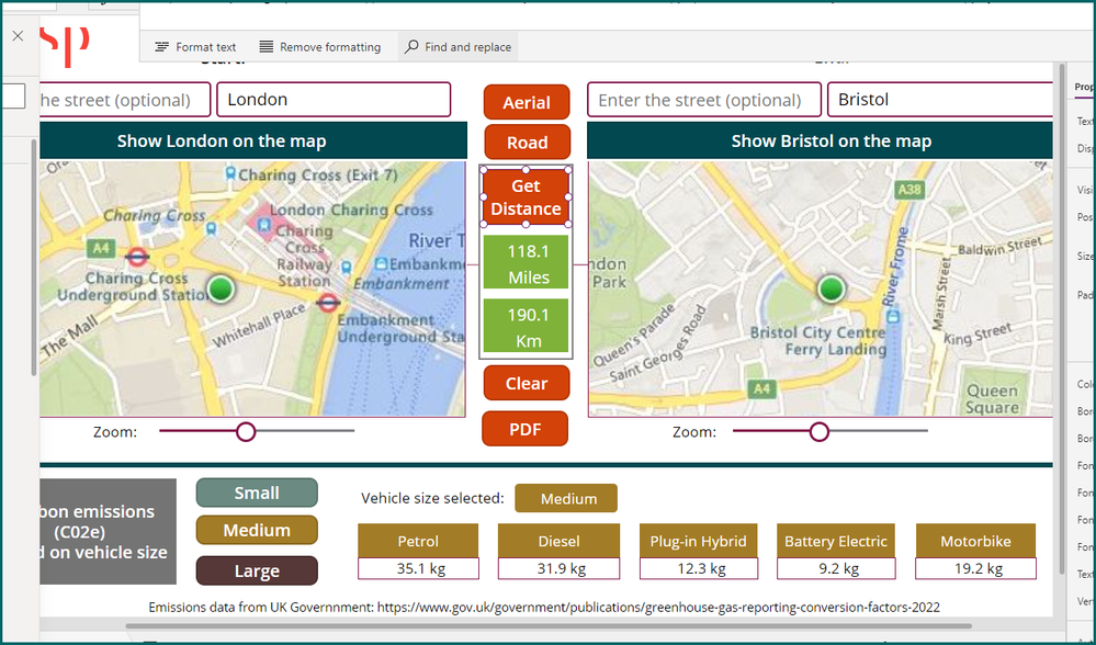 Set(distance, BingMaps.GetRoute((txtStartStreet.Text&", "&txtStartTown.Text), (txtEndStreet.Text&", "&txtEndTown.Text), {distanceUnit: "Mile" }))Rob