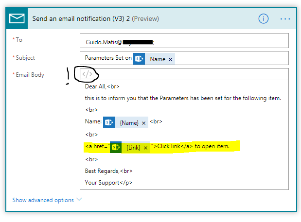 I have created a Flow that sends a task to Planner when a SP-item is created. Now I need to include a clickable link to the SP-item in the Planner description field. How do I achieve this?