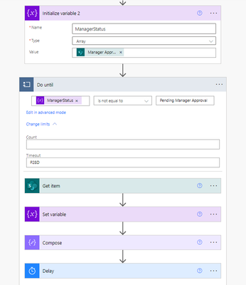 I am having trouble with the initialize variable part. The error I am receiving is below. The end goal is to loop until Manager status is not "Pending Manager Approval". I would also like to make sure the rest of the flow is okay but I cannot get past the initialize variable.