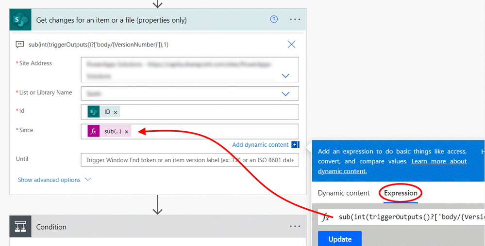 The first action is "get changes for an item or a file (properties only)". For the ID field you select ID from the dynamic content box. For the Since field you need to add the following expression into the Expression tab in the dynamic content box. This expression is what compares the current version to the previous one: