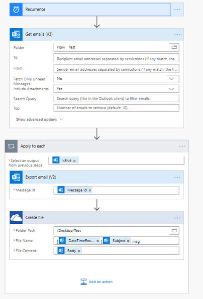Hi I would like to get all of the mails from one folder and save them to Onedrive. However, as the test result,I could not move all of mails, just 2 mails have been saved to onedrive successfull...