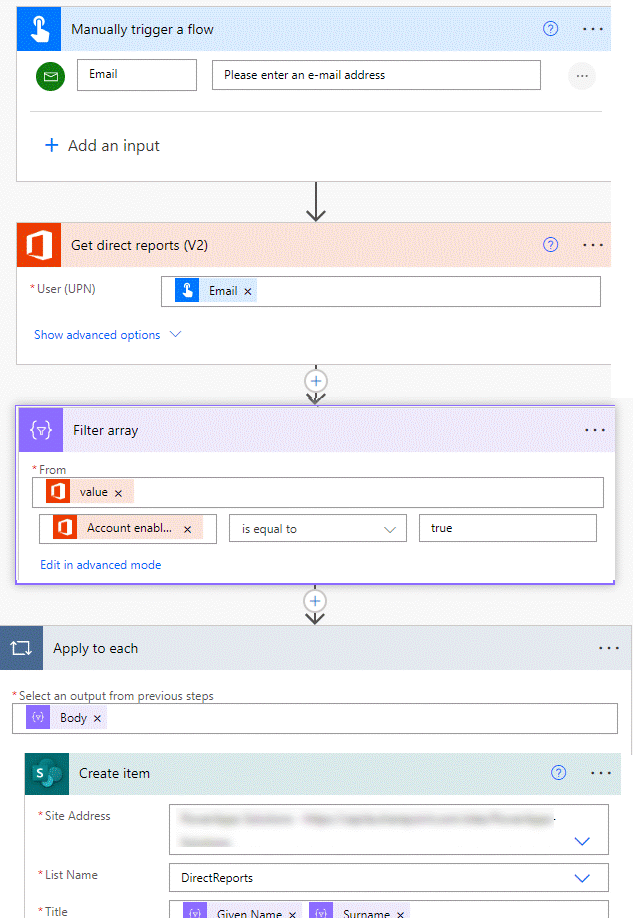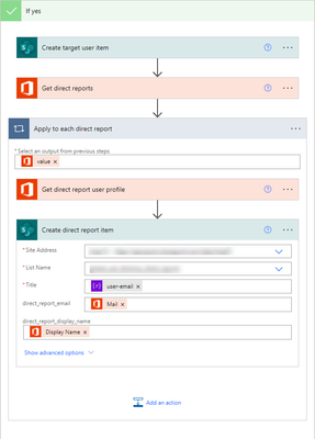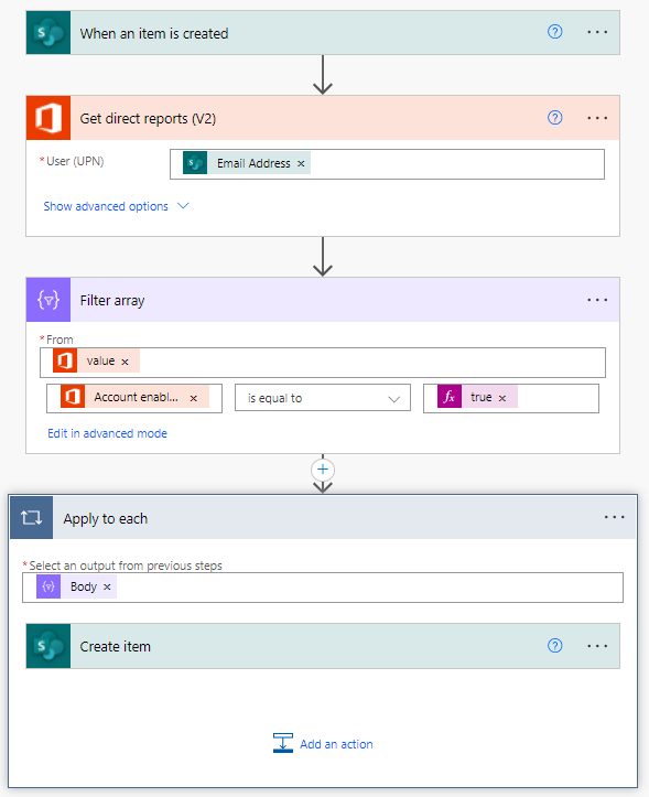 Hi ADumith , if your aim is to capture all direct reports for an active account in a list you can do it like this, assuming you have a condition looking for AccountEnabled is true. I've tested this and it works well for me. The 'Create target user item' is not strictly necessary but I chose to keep a record of the email addresses I was entering during the test.