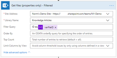 - Add "Get files (properties only)" action. Point it to your site and document library. Add "Filter Query": ID eq variable from previous step.