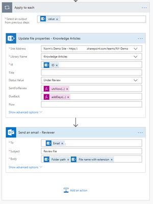 - Add "Update file properties" action. Point it to your site and document library. Set "Status Value". Set "Sent For Review" to expression utcNow('yyyy-MM-dd'). Set "Due Back" to expression addDays(utcnow('yyyy-MM-dd'), 5) - you'll have to figure out the business days requirement.
