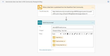 darren365 these are always useful . The view in our company is that our 65,000 people already get a blizzard of emails so instead of sending them an email when a new blog is published, most of whom won't be interested, we post it to a dedicated Office 365 Blogs community in Yammer. As I'm the admin of the SharePoint community it comes as posted from me and we have other flows for other blogs with different admins.