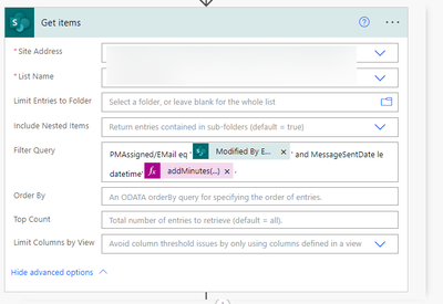 Then query the SharePoint list for all items where the the current user is the assignee and where that date is less than the current date minus 15 minutes. If that returns an element, then do not sent an emailPMAssigned/EMail eq '@{triggerOutputs()?['body/Editor/Email']}' and MessageSentDate le datetime'@{addMinutes(utcNow(),-15)}'length(outputs('Get_items')?['body/value'])