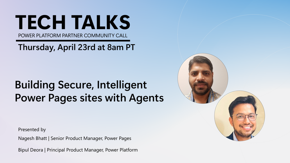 Join us on Thursday, April 23rd at 8am PT as Nagesh Bhatt, Senior Product Manager, Power Pages and Bipul Deora, Principal Product Manager, Power Platform present 'Building Secure, Intelligent Power Pages sites with Agents'.
