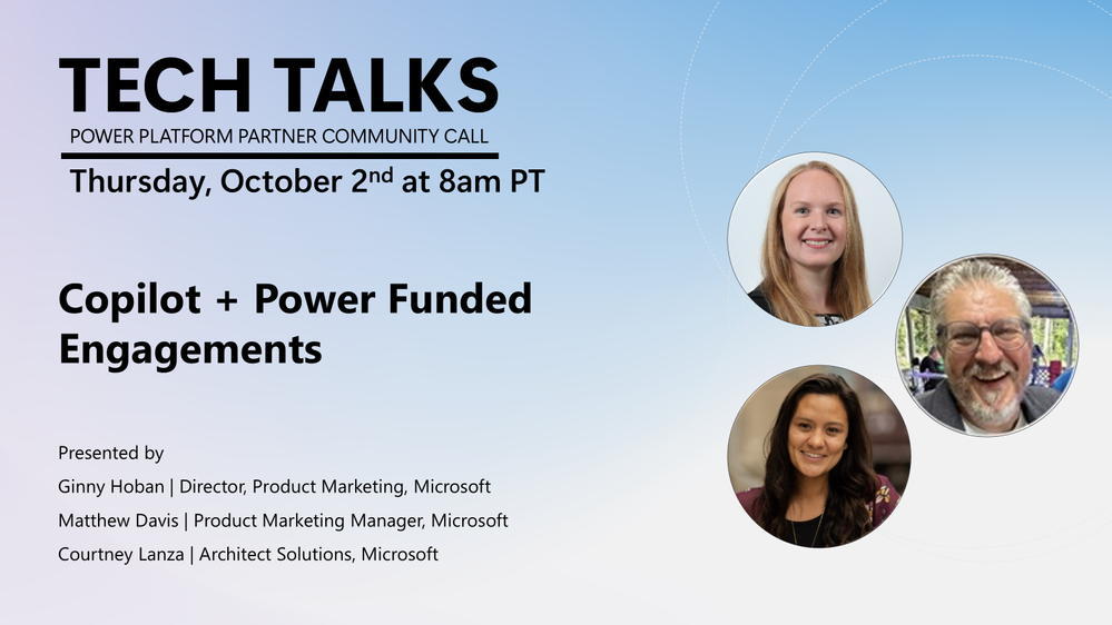 Join us on Thursday, October 2nd at 8am PT as Ginny Hoban, Director, Product Marketing, Microsoft; Matthew Davis, Product Marketing Manager, Microsoft; Courtney Lanza, Architect Solutions, Microsoft present 'Copilot + Power Funded Engagements'.
