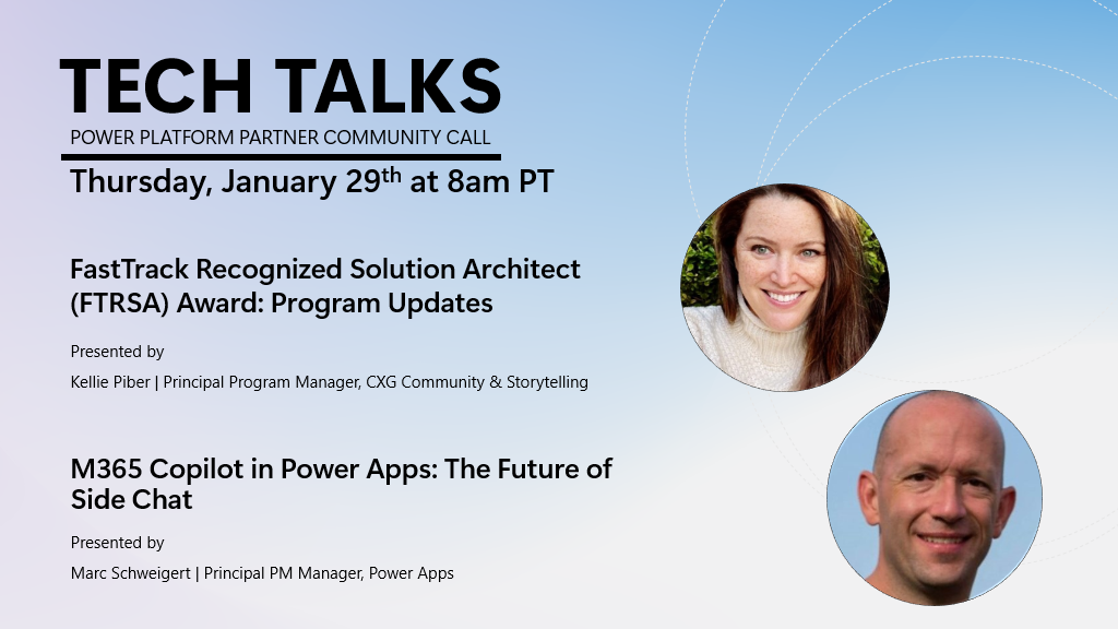 Join us on Thursday, January 29th at 8am PT as Kellie Piber, Principal Program Manager, CXG Community & Storytelling presents 'FastTrack Recognized Solution Architect (FTRSA) Award: Program Updates' and Marc Schweigert, Principal PM Manager, Power Apps presents 'M365 Copilot in Power Apps: The Future of Side Chat'.
