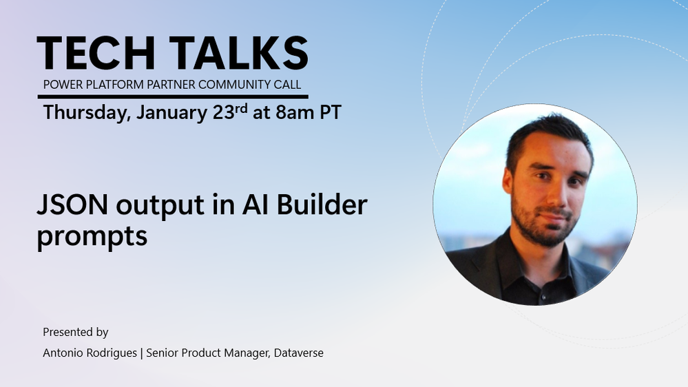 Join us on Thursday, January 23rd at 8am PT as Antonio Rodrigues, Senior Product Manager, Dataverse presents 'JSON output in AI Builder prompts'.