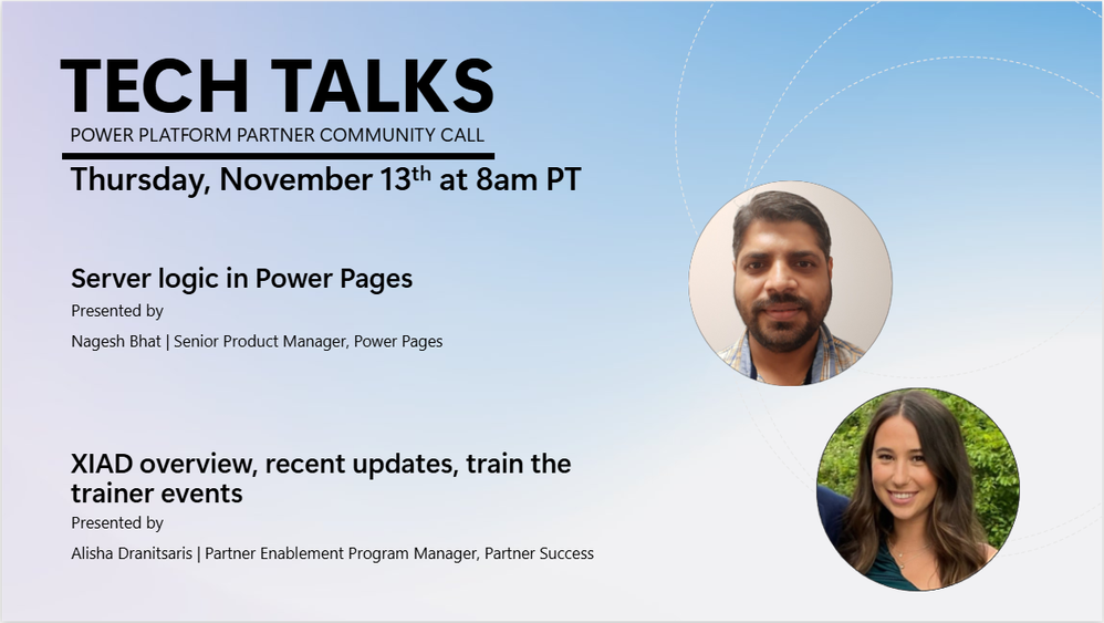 Join us on Thursday, November 13th at 8am PT as Nagesh Bhat, Senior Product Manager, Power Pages presents 'Server logic in Power Pages' and Alisha Dranitsaris, Partner Enablement Program Manager, Partner Success presents 'XIAD overview, recent updates, train the trainer events'.