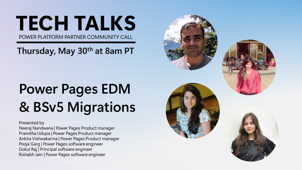 Join us on Thursday, May 30th at 8am PT as Power Pages Product Managers, Neeraj Nandwana, Pramitha Udupa, Ankita Vishwakarma and Power Pages Software Engineer, Pooja Garg, present Migrate Standard Data Model Power Pages Sites to Enhanced Data Model & Migrate Bootstrap v3 sites to Bootstrap v5.