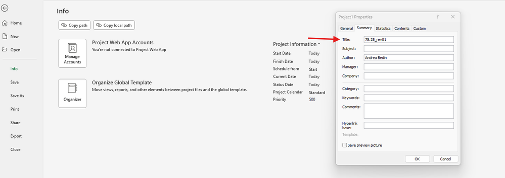 Going to: Info / Project Information / Advanced properties, the title remained "78.25_rev01".