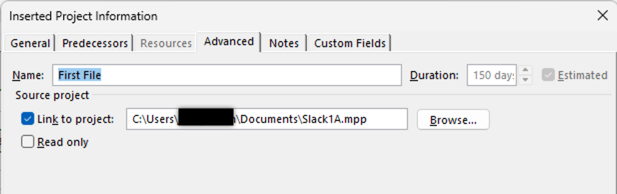 However, I have a concern about your master file structure. You indicate that in your initial testing you created the "78.25_rev01" to see how it would work as a subproject in your master. Then you say you deleted it. I asked before but didn't get an answer. How exactly did you "delete" it from the master? Simply selecting the subproject in the master and hitting "delete" is NOT the correct process. Yes, it will delete the subproject but it will also leave a link fragment in the subpproject and corrupt the structure. The correct process for removing a subproject from a dynamic master is to double click on the subproject's summary line insertion point in the master. That will bring up the Inserted Project Information window, similar to the screen shot below.
