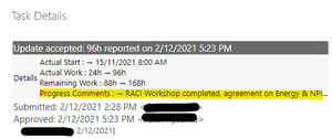 I appreciate you coming back. We use the progress comments pure on exception. It a particular task is running late, the resource needs to provide explanation for the cause and what is being done about it. These are then exported to weekly progress report.