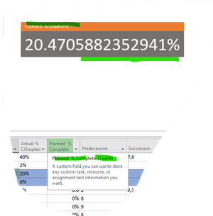 i, Hi, I am new to MS project, I am preparing the project report with the planned percentage of completion. Since this column has the formula to convert number into percentage, it is giving lon...