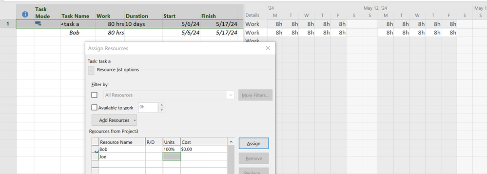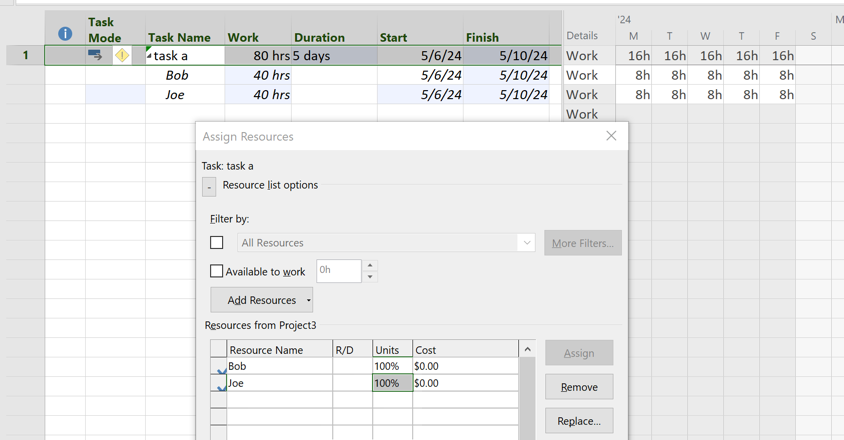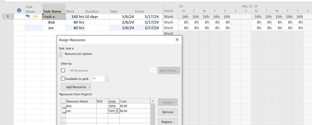 Now I assign a second resource. The total work is doubled but the duration remains at 10 days with each resource working a normal 8 hr day.