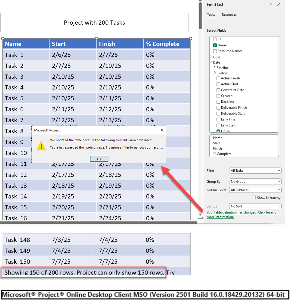 I provide a monthly PMP status report. When I print the status report, I notice a message at the bottom stating, "Only showing 75 items out of 118 rows. The project can only show 75 rows." I have the desktop version of MS2019. Is it possible to extend the number of rows to 120 or more?