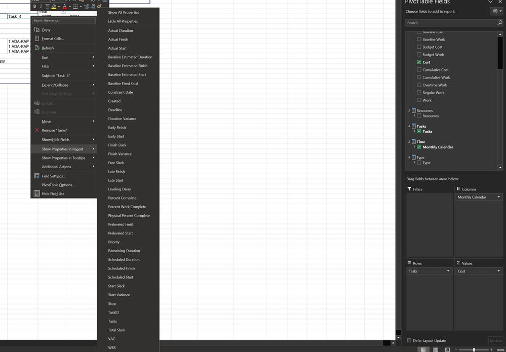 I understand you can add Custom Fields to your Visual Reports via 'Edit Template', and after some playing around, I figured out how to find these items (As they never showed up in the Pivot Table Field list). Firstly, I would drill down on the Pivot Table to a certain level, then by right clicking the task (In the example below, Task 4) → hover over 'Show Properties in Report' → You can then see these Custom Fields and other useful fields to display. Unfortunately I haven't found a BI Tool for custom Excel Reports using MS Project Desktop, this would be ideal.