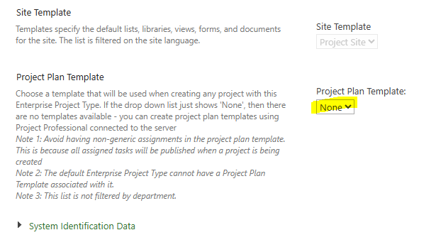 Hello, I have created Enterprise Project Types and created Project templates that have been uploaded as "templates" however in the drop-down menu, "None" is showing up (as per the image). Could you please advise whether I have missing something in terms of the setup? Thank you.