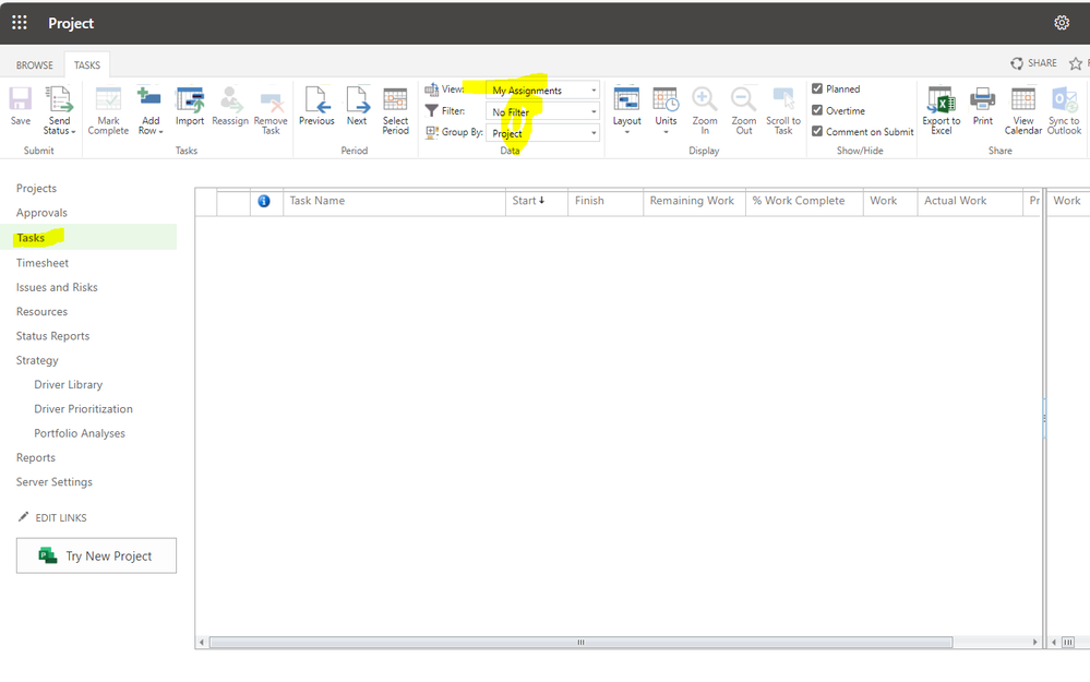 I am having this issue of not seeing any tasks in Tasks page that are assigned to me. All my tasks are published. I still cannot see any thing in Tasks section. I am also the owner of the PWA. All my resources are Committed and are Enterprise Resources brought into project via Build team. All I see in Tasks section is this: