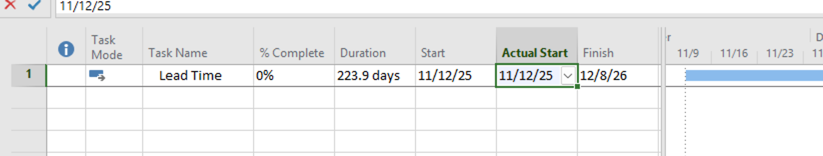 We have a task with a Start date of 11/12/25 and Finish date of 1/20/27. The duration is 223.9 days based on a 4 day/10 hrs per day calendar (it is a long lead time material procurement task). The status date is 1/5/26 and the task has an Actual Start of 11/12/25. When I enter 10 in the % complete column and hit enter, Project changes this to 0%. When I enter 15 in the % complete column and hit enter, Project changes this to 5%. When I enter 50 in the % complete column and hit enter, Project changes this to 44%.