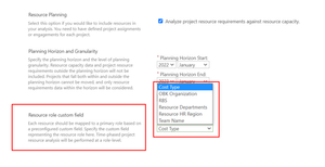 Hi I tried to create a new portfolio analysis scenario which covers Resource Planning perspective. I think the problem is with the Resource Role Custom Field that you have to select: ...
