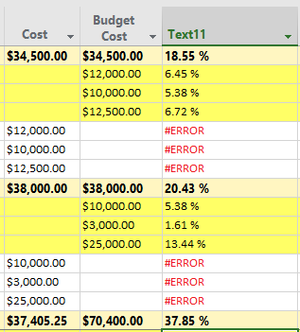 Hi     I am trying to reference a null field but I am not getting right. I am trying to display "%" after my calculation. So I have a number column called Budget Cost. I created a Text11 column and h...