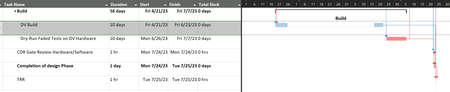 The task split (...) color for the DV Build task is red, which indicates that Microsoft Project recognizes that this task is a Critical task. However, you or someone else has applied custom bar formatting to the Gantt bar for this task. You can clearly see the custom bar formatting for this task's Gantt bar since it contains the cross-hatch pattern as well as the blue color.