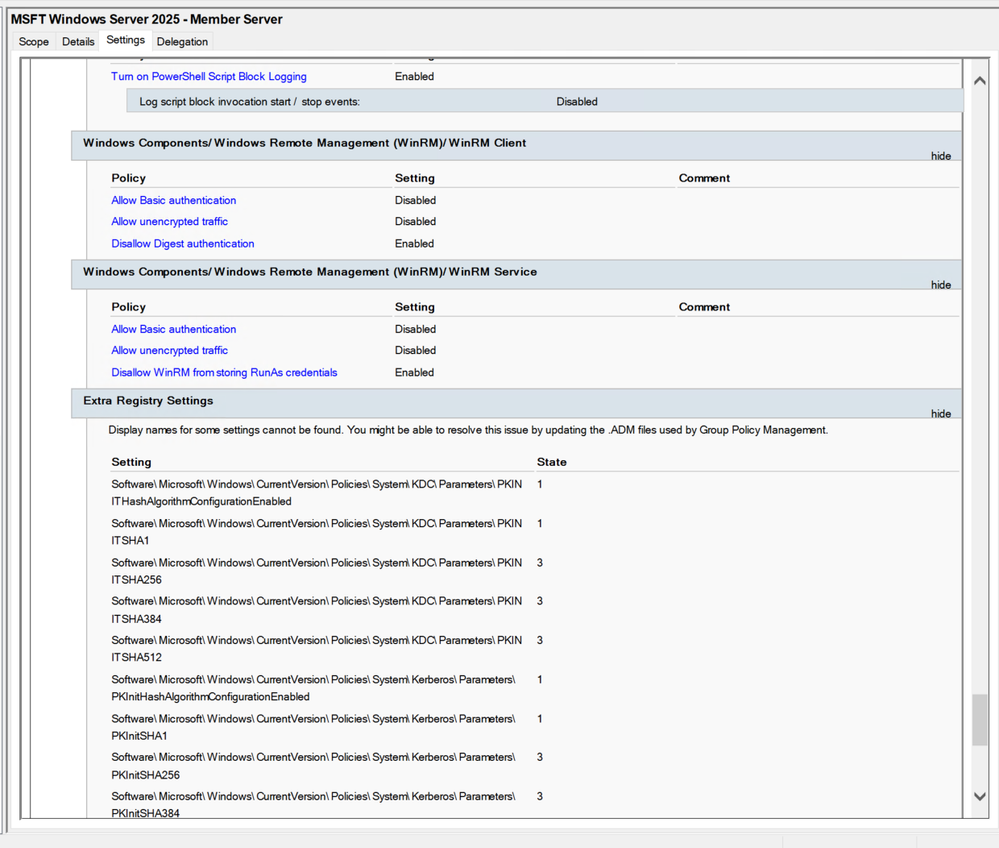 For MSFT Windows Server 2025 - Member Server, there is a whole list of Extra Registry Settings.