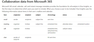 • https://docs.microsoft.com/en-us/viva/insights/use/metric-filters - All collaboration metadata signals (generated by any M365 activity when