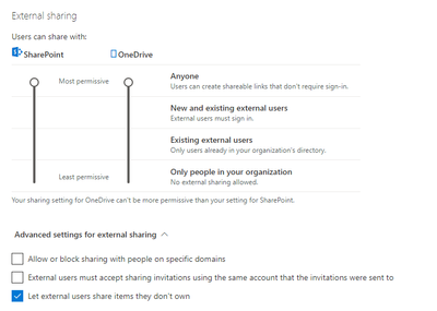 Hello, please see the sharing policies in OneDrive admin center (see image below):NOTE! The image is just for instructions, it does not represent best-practice regarding sharing policies.