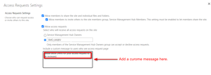 Hello, I have over 200 SharePoint sites. I want to add a custom message into the box/area just under the "Include a custom message to users who see access request page" for all this sites at ...