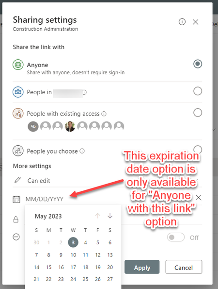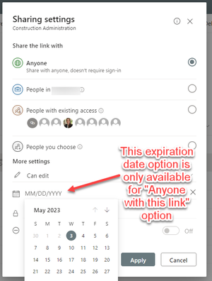 Good afternoon, I noticed today that the expiration date option for sharing links is only available for the "Anyone with this link" option. Is it possible to also have that option availa...