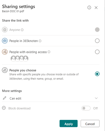 People you choose let's you choose the people you want to give access to. You can also share that file with external people, If external sharing is enabled for your site. They have to authenticate using an M365 Account from their organization or by creating a microsoft account.