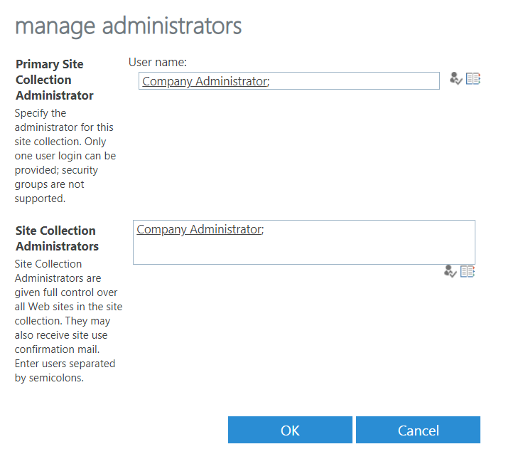 I want to start a new sharepoint project and i am planning to work on the classic team site root site collection. now i checked the "Site collection Administrator" for the root site collection, and i found that the "Company Administrator" is already defined, as follow:-