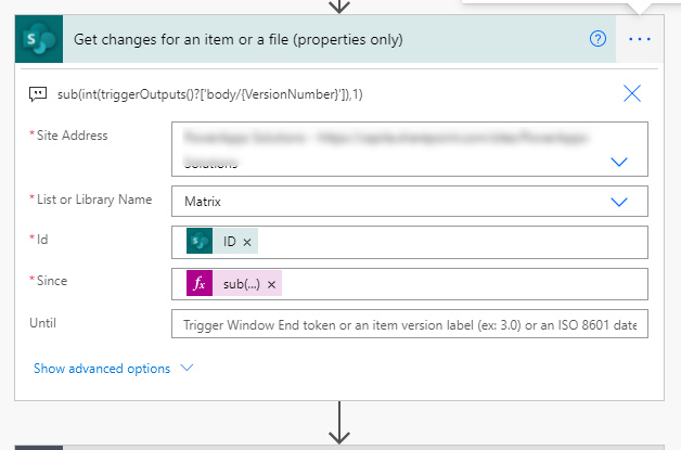 Next, add a "Get changes for an item or a file (properties only)" action, and because we want the changes since the previous version add the following expression into the Since field: