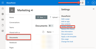 2. Now select Document library (where your documents are) to go Settings > Library settings. Click on Permissions for this Document library.