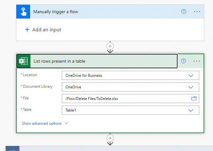 The first action will be the Excel for Business List rows present in a table. Click in the location field and select One Drive for Business. Click the the Document library field and select OneDrive. Click the folder icon in the File field and navigate to your spreadsheet and select it. Then in the Table field select the table name from the spreadsheet.