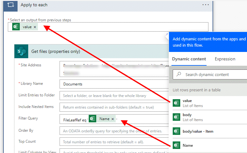 Inside the apply to each add a Get files (properties only) action. Click in the site address field and select your SharePoint site. Click in the library name field and select Documents (or whichever library your documents are in). In this action click show advanced options and in the filter query field type FileLeafRef eq '' and inside the single quotes select Name from the list rows present in a table section of the dynamic content box.