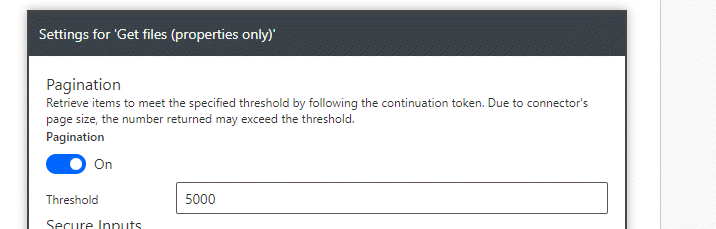 By default this action will only list up to 256 rows so to increase this click the 3 dots in the top right of the action and select Settings. Turn the pagination toggle on and in the Threshold field type 5000 then click Done at the bottom of the Settings pane: