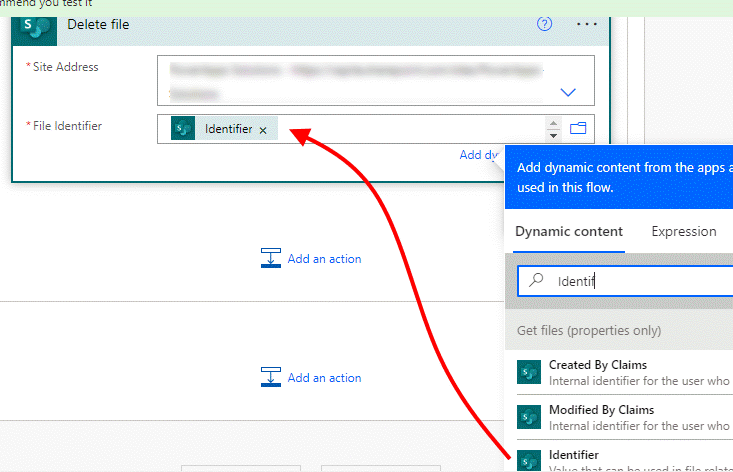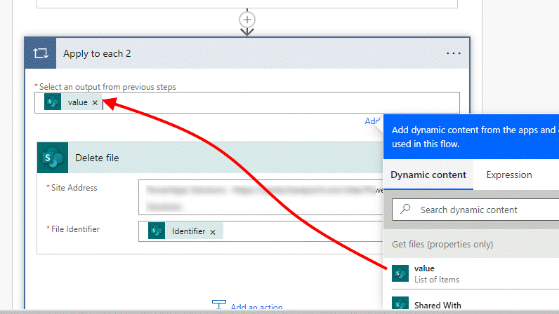 Next, add another apply to each, click in the first field and select value from the Get files (properties only) section of the dynamic content box:Still inside the apply to each, add a Delete file action, select your site and in the file identifier field select Identifier. Note, do not select ID or the flow will error.