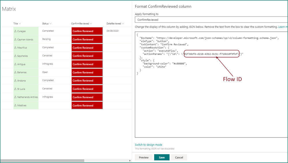 { "$schema": "https://developer.microsoft.com/json-schemas/sp/v2/column-formatting.schema.json", "elmType": "button", "txtContent": "Confirm Reviewed", "customRowAction": { "action": "executeFlow", "actionParams": "{\"id\": \"01f36bf6-d218-43b2-8c9c-f718b10f9fbf\"}" }, "style": { "background-color": "#c00000", "color": "white" } }Later on you'll change the ID to your flow's ID.