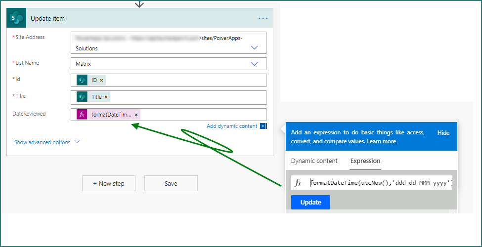 Next you need to update the item with today's date in the Date Reviewed column::