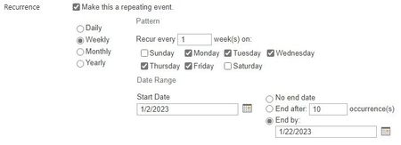 Note that this formula assumes that the recurring event is set to occur weekly (Monday-Friday) as in your example. If the recurrence pattern is different, you may need to modify the formula accordingly.
