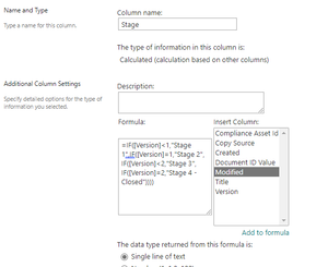 I'm trying to get a column within SharePoint that references another column. Basically: If the Version is <1, column returns Stage 1 If the Version is =1, column returns Stage 2 If the Vers...